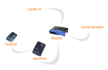 de un adaptor. Adaptorul se conectează la Internet prin
